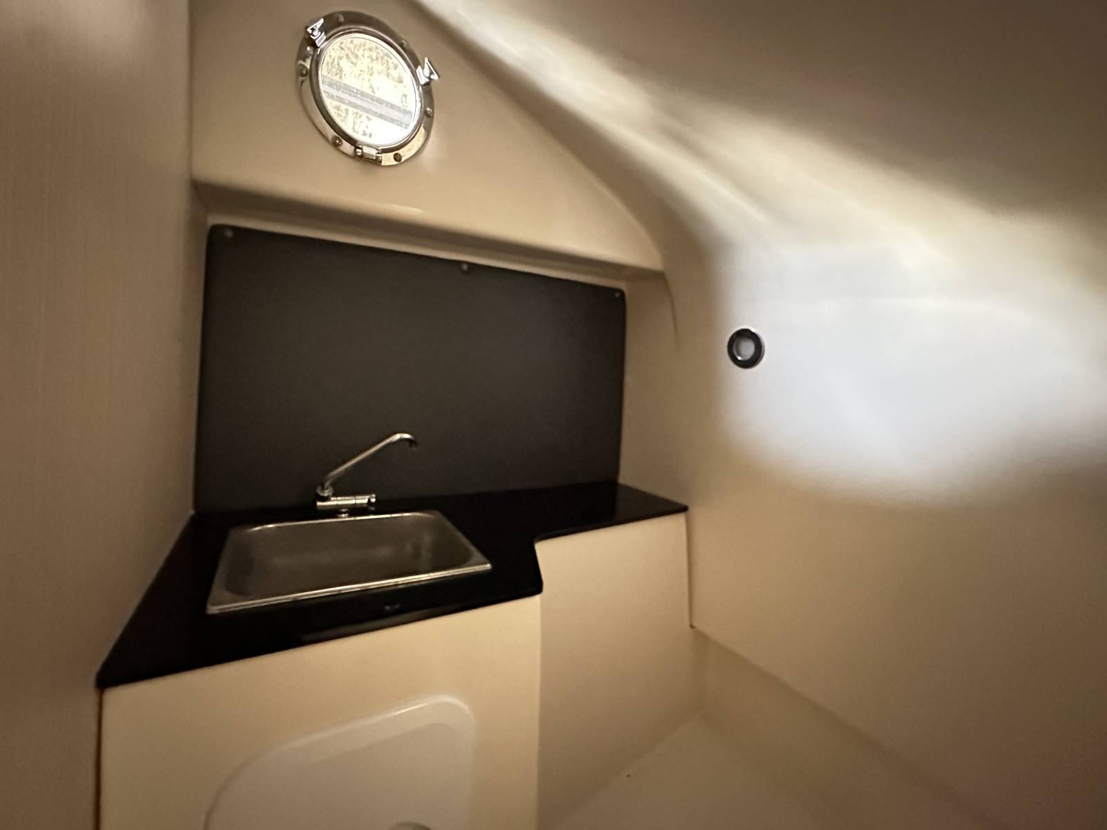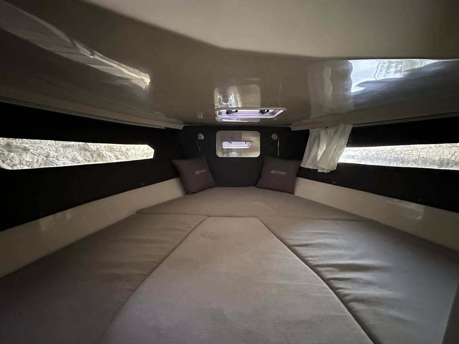 Bains de soleil avant et arrière, table de cockpit, Bimini, cuisine extérieure avec évier, guindeau électrique, taud de cockpit, 1 cabine, deux couchages.