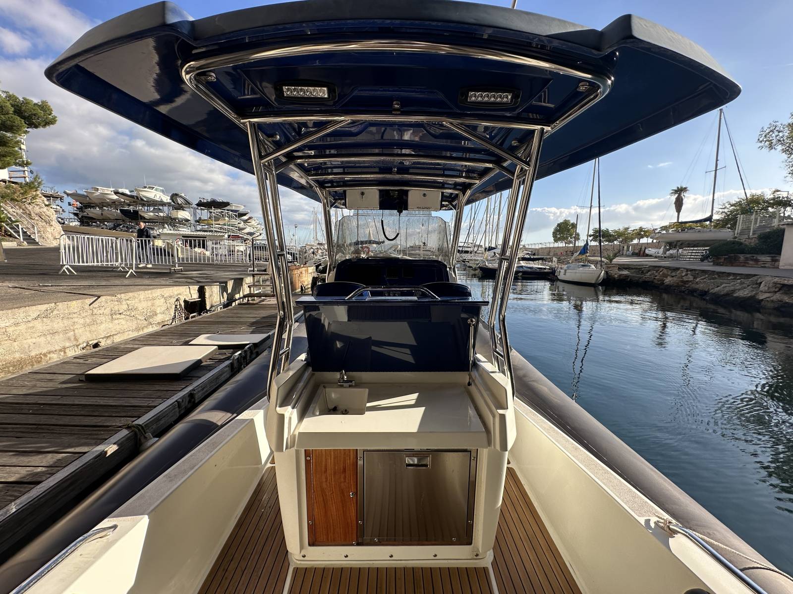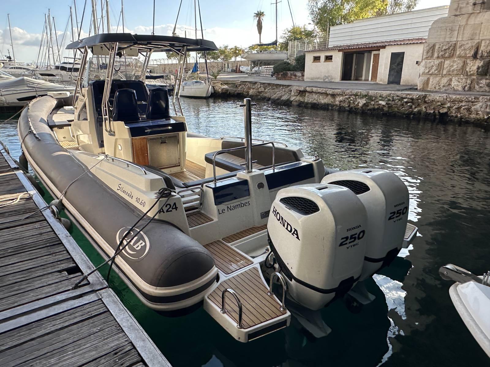 Semi-rigide polyester avec flotteurs Hypalon,pouvant accueillir jusqu’à 16 personnes en navigation. Cuisine extérieure avec évier et réfrigérateur, table de cockpit, coussins de cockpit, bain de soleil avant, T-top inox.