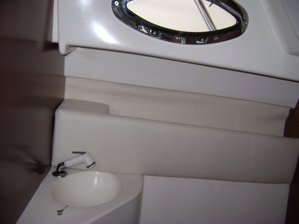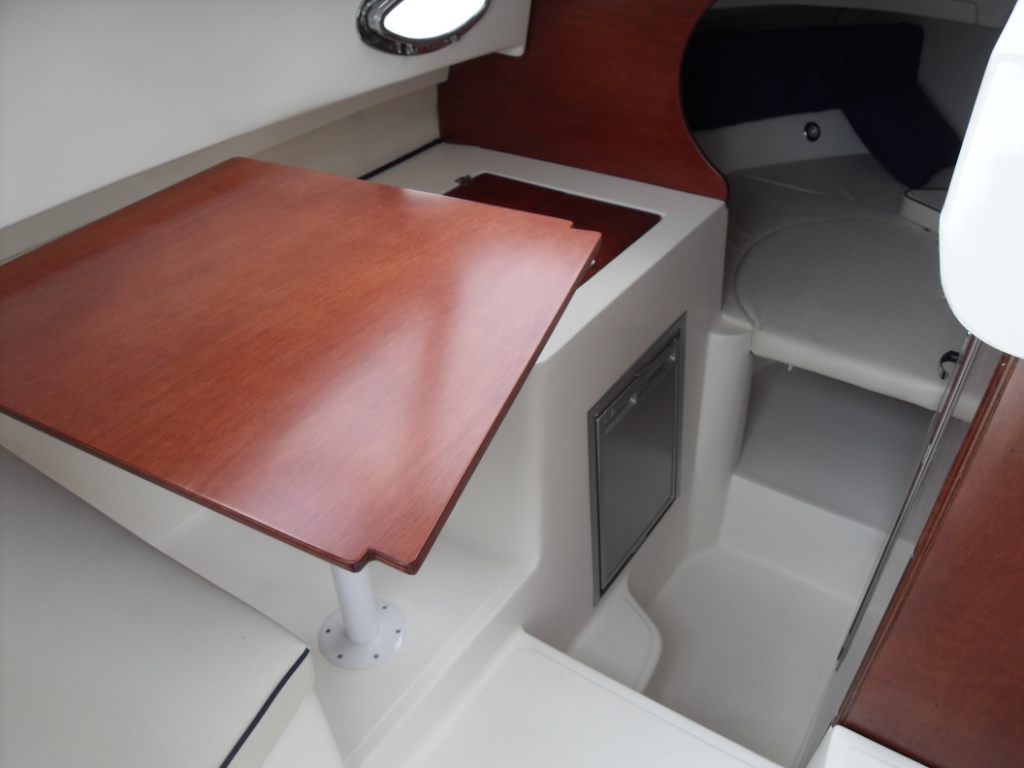 Son carré très claire regroupe une dinnette transfromable en couchage, un bloc cuisine avec évier, gaz et frigo, un cabinet de toilette avec lavabo, et sur l'avant un très large couchage double. Tout cela avec de nombreux hublots ouvrants!